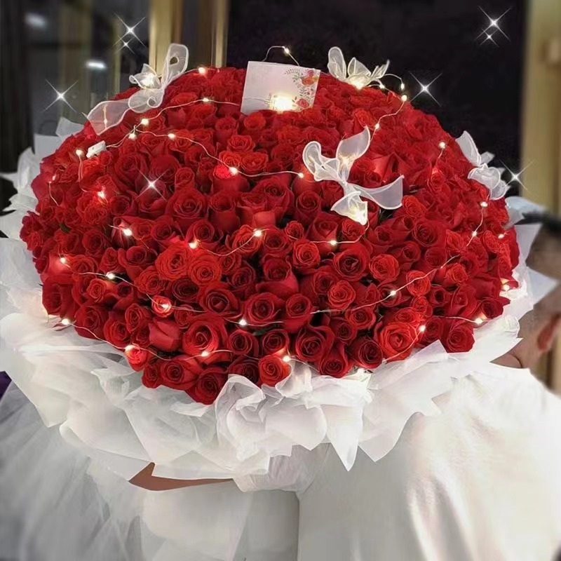 花材: 365朵红玫瑰,蝴蝶结、灯串装饰花面。
