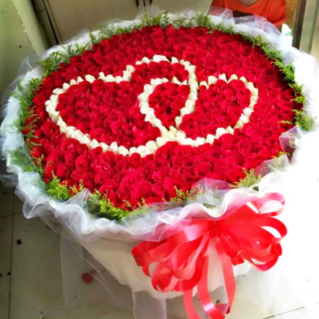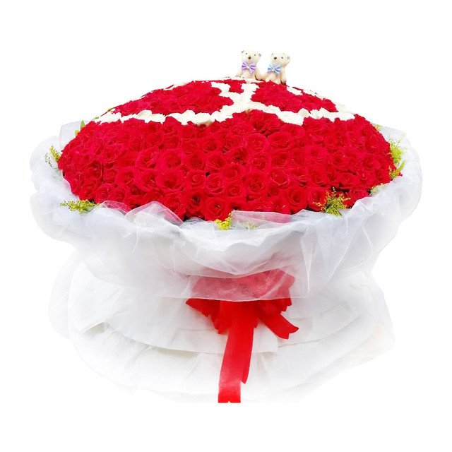 花 材:红玫瑰、白玫瑰365朵搭配而成,一对小熊,外围黄莺点缀。