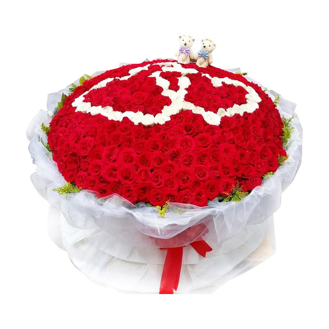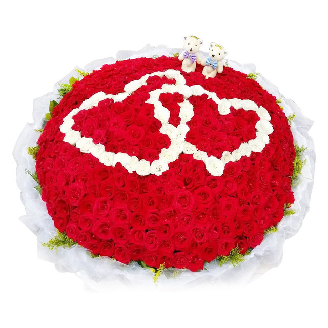 花材: 红玫瑰、白玫瑰365朵搭配而成,一对小熊,外围黄莺点缀。