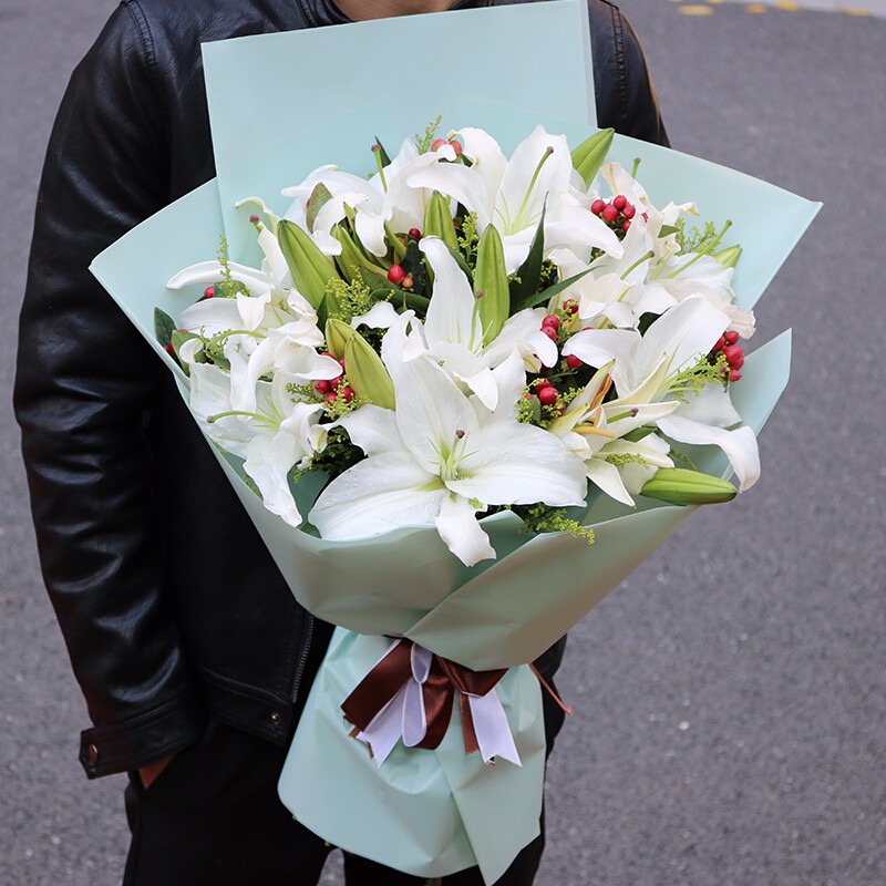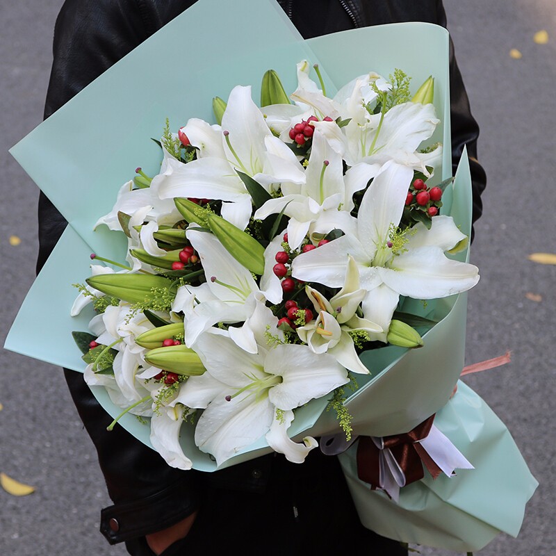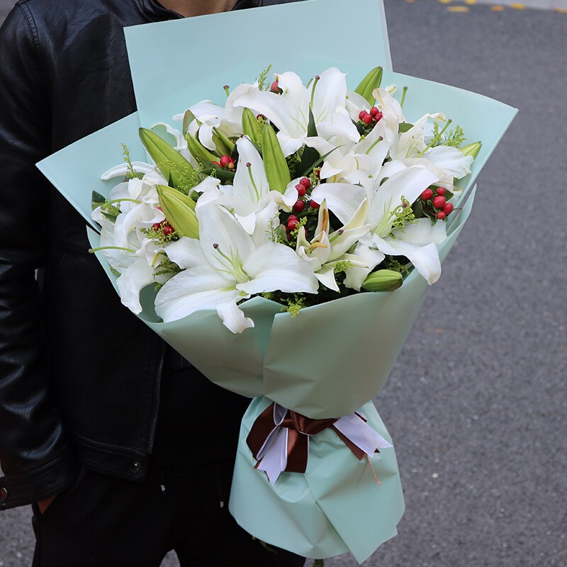 花材: 18朵白色香水百合,搭配红豆、绿叶、黄莺装饰。