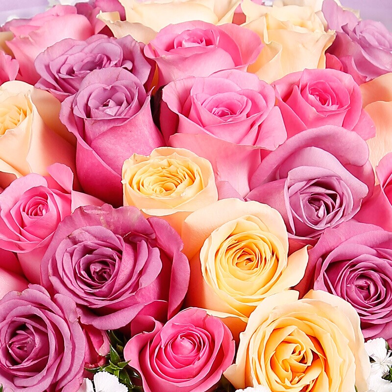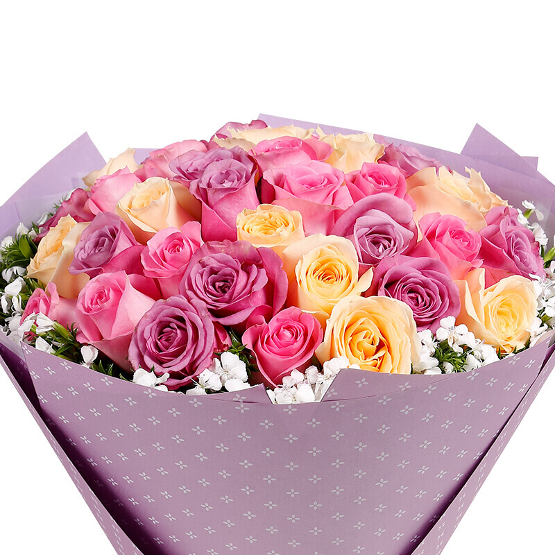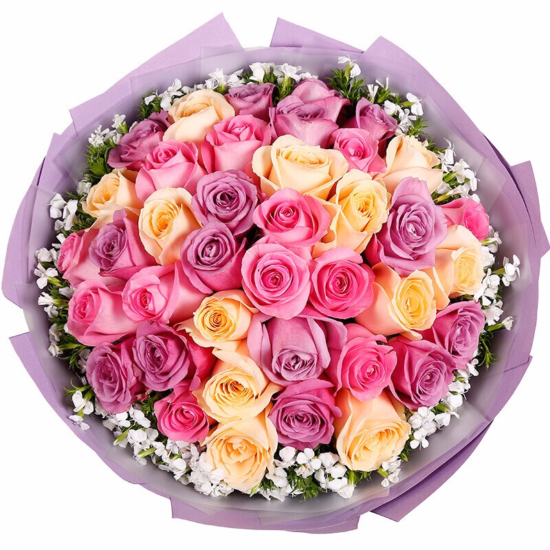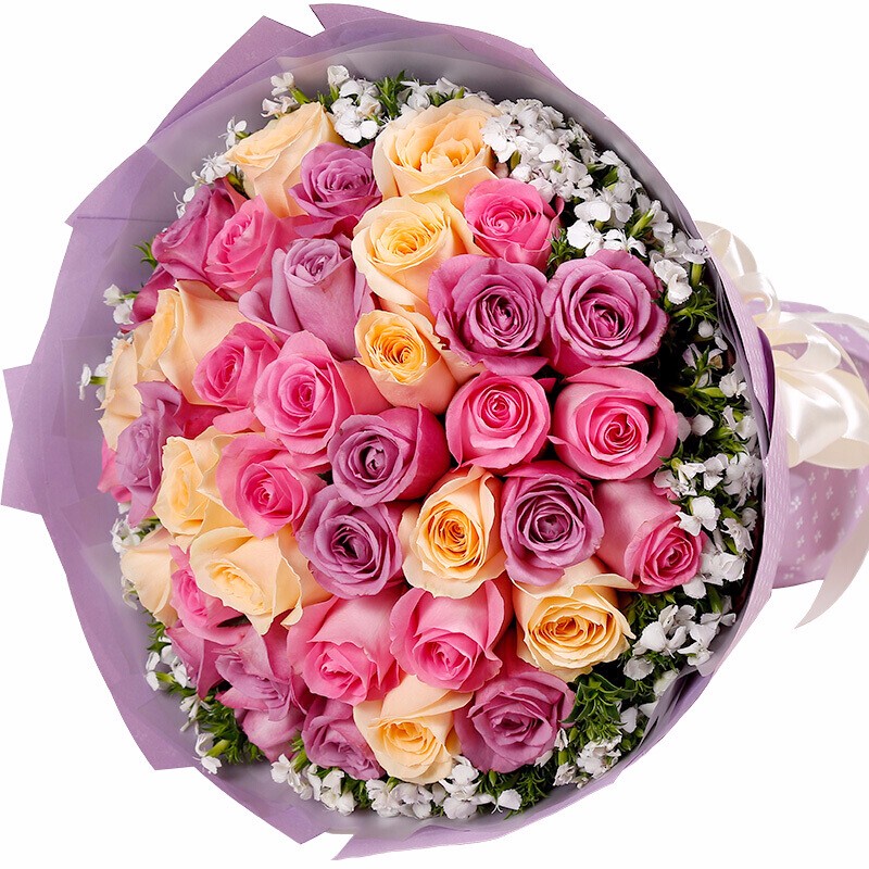 花材: 33枝混搭粉玫瑰、香槟玫瑰、紫玫瑰,外围白色相思梅;