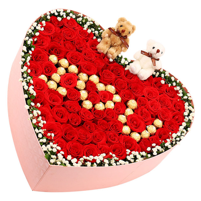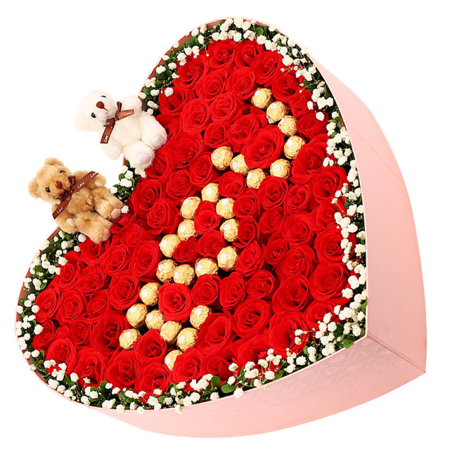花材: 73朵精品红玫瑰,26颗巧克力,2只小熊,满天星环绕。
