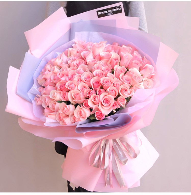 包 装:白色雪梨纸+浅灰色雾面纸+粉色雾面纸包装,粉色英文丝带+香槟色英文丝带束扎。