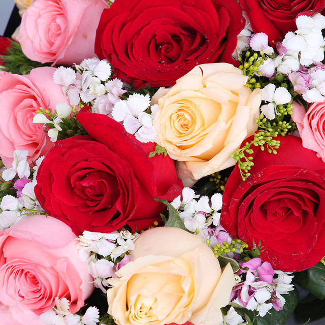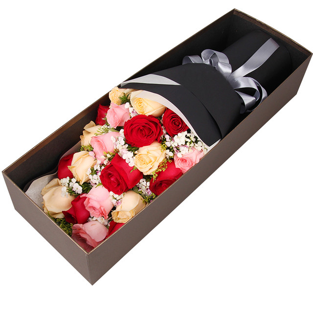 花材: 19朵混色玫瑰(香槟、粉、红),黄莺、相思梅。