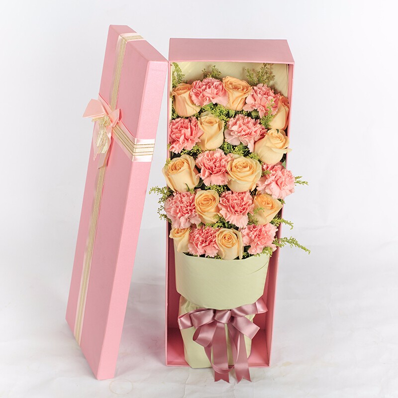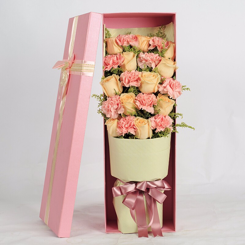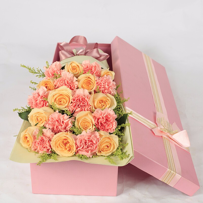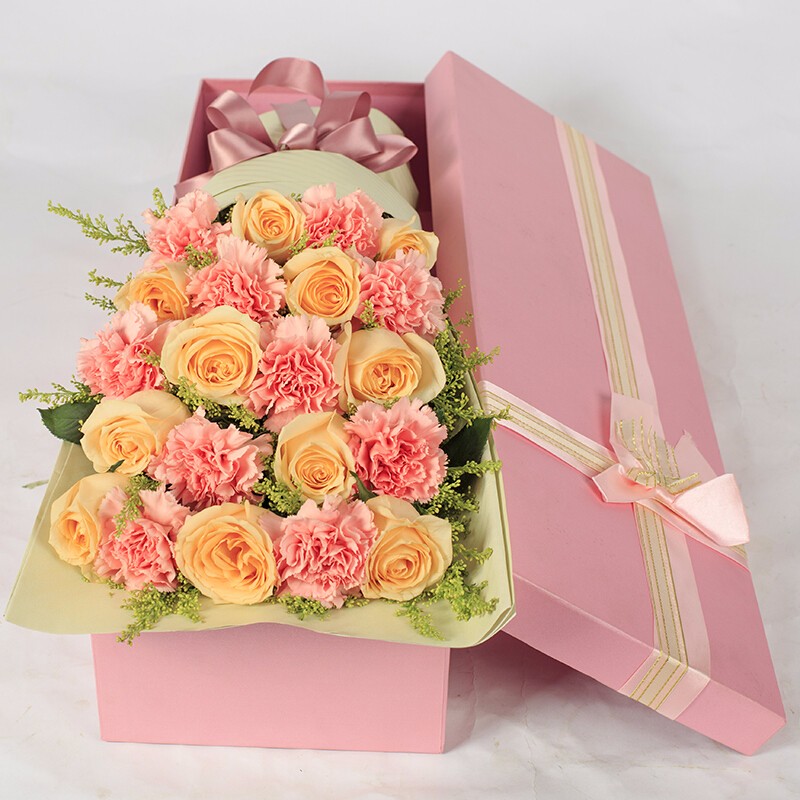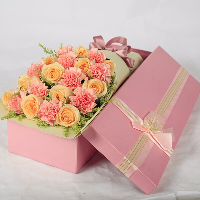 花材: 11朵精品香槟玫瑰,10朵粉色康乃馨,搭配黄莺装饰。