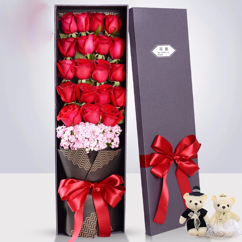 花材: 19枝红玫瑰,2只小熊,搭配满天星。