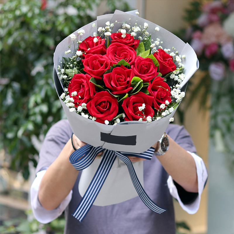 花 材:11枝红玫瑰,搭配满天星、栀子叶。
