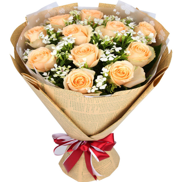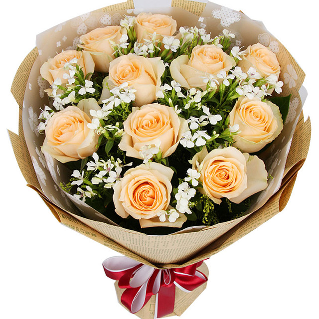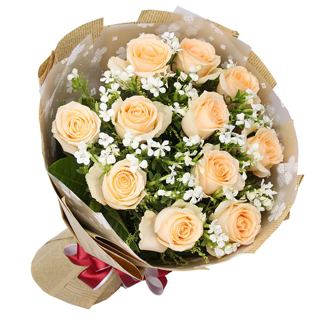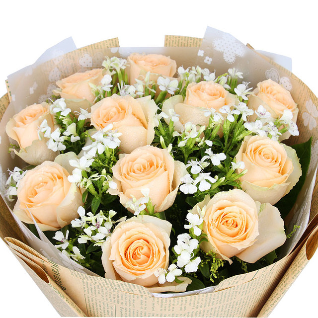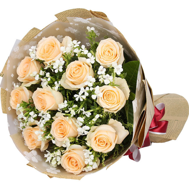 花材: 11朵香槟玫瑰,搭配相思梅,黄莺。