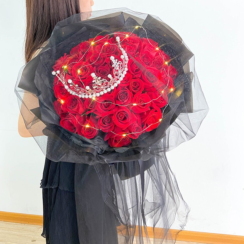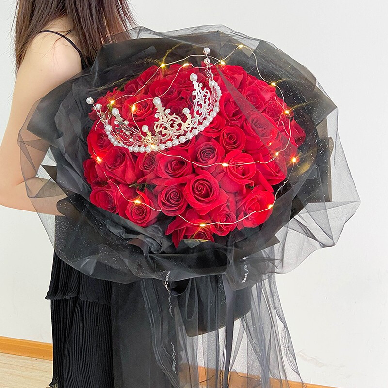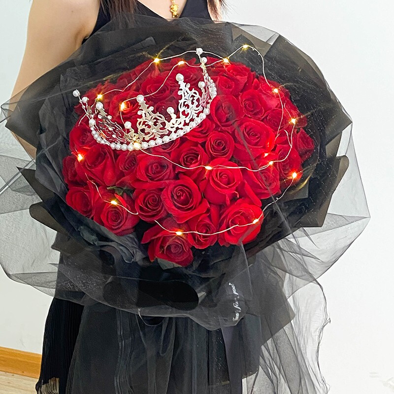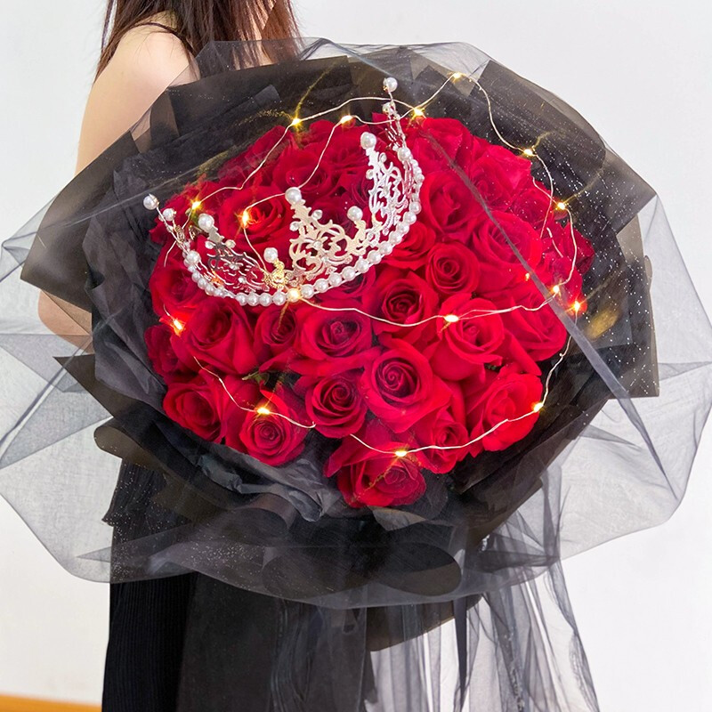 花 材:33支精品红玫瑰,可发光灯带+精美皇冠装饰。