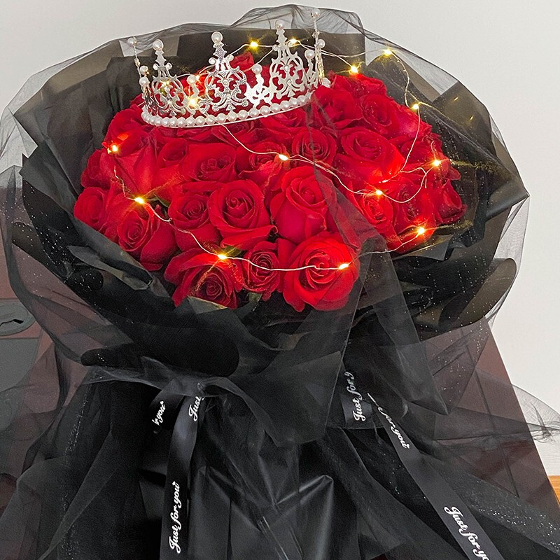 花材: 33支精品红玫瑰,可发光灯带+精美皇冠装饰。