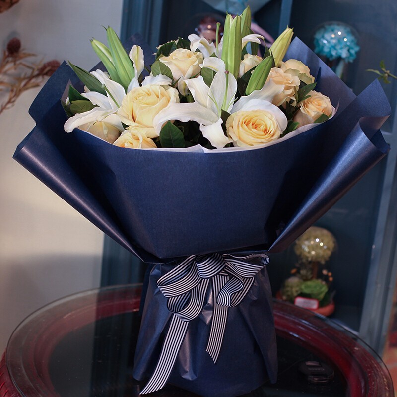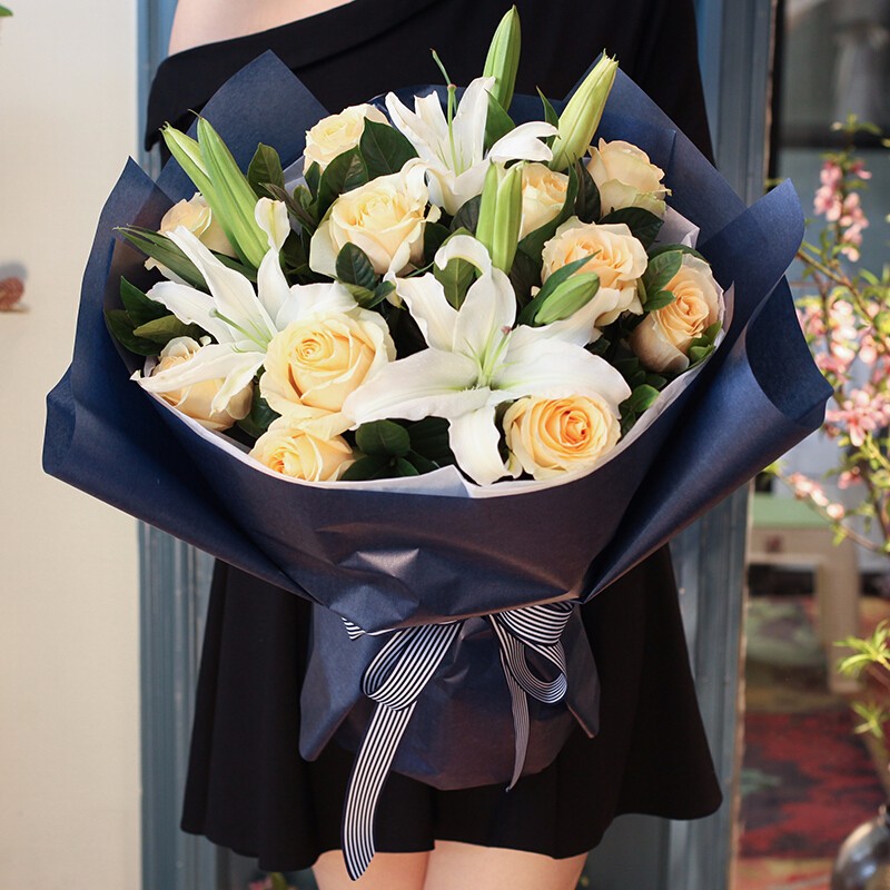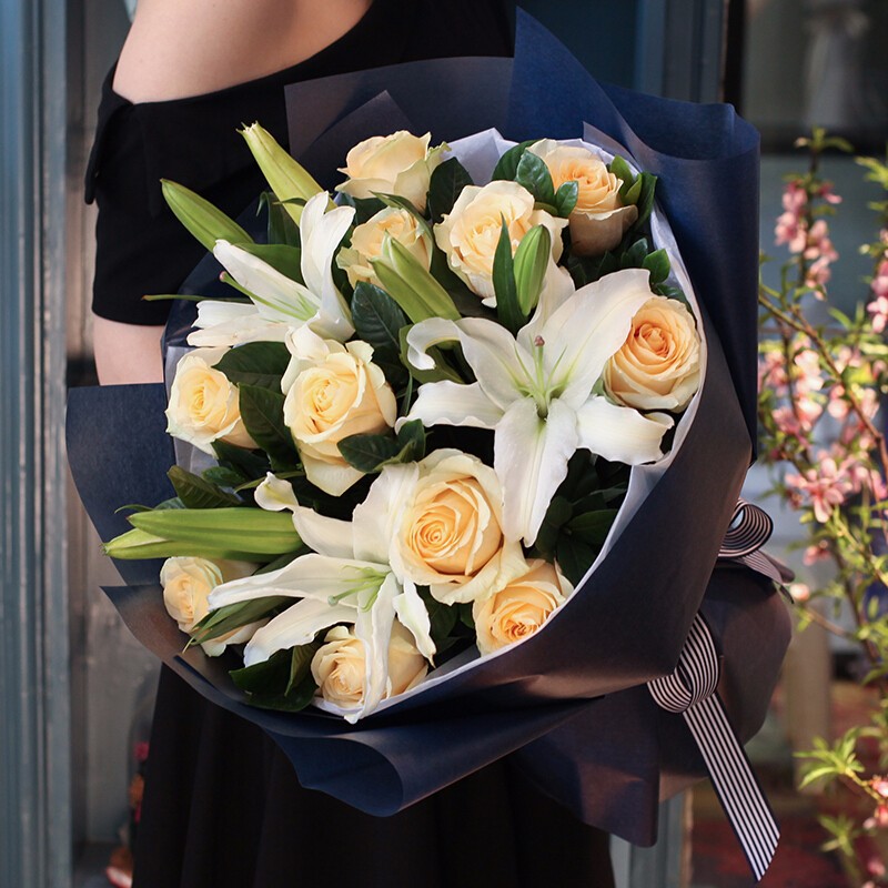 花材: 精选11朵香槟玫瑰,2支多头白色香水百合,搭配栀子叶装饰。