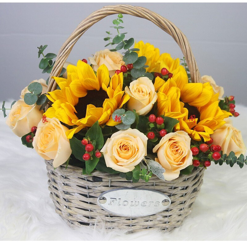 花材: 精选11朵香槟玫瑰,3朵向日葵,搭配红豆、尤加利叶装饰。