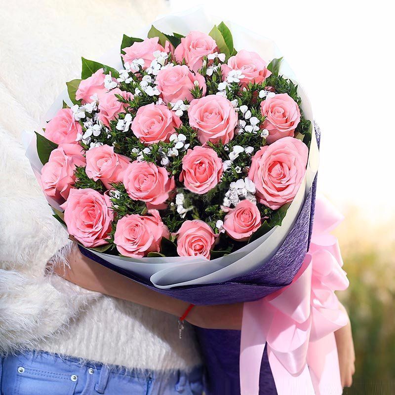 花材: 19朵粉玫瑰,搭配石竹梅,栀子叶。