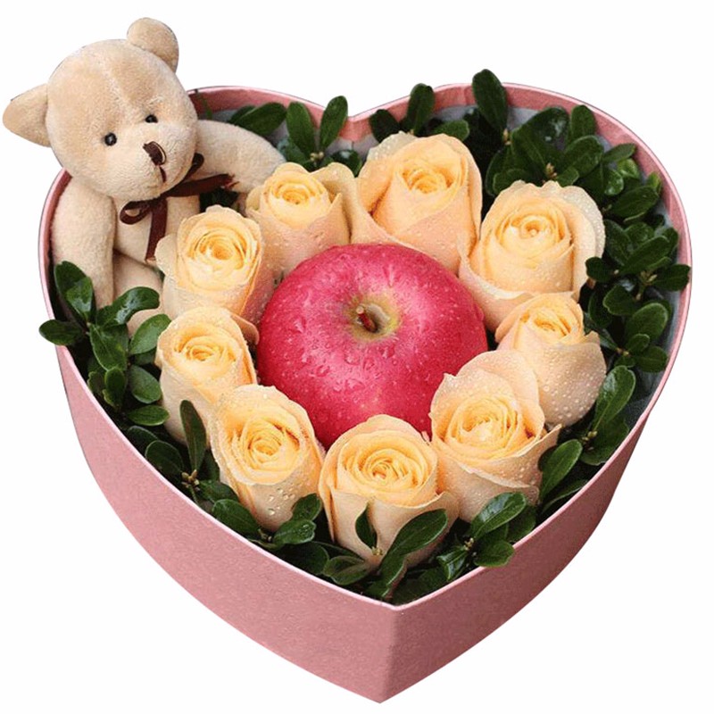 花 材:9朵香槟玫瑰、1颗红苹果、1只可爱小熊,搭配适量绿叶装饰。