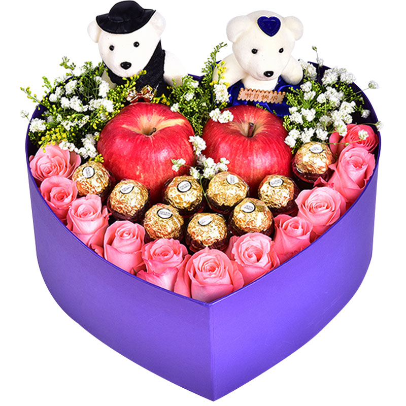 花材: 11朵戴安娜粉玫瑰、9颗费列罗巧克力、2颗红苹果,搭配适量2只可爱小熊、白色满天星、黄莺草装饰。
