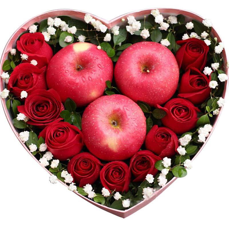 花材: 红苹果3颗,红玫瑰11朵,搭配适量白色满天星、绿叶装饰。