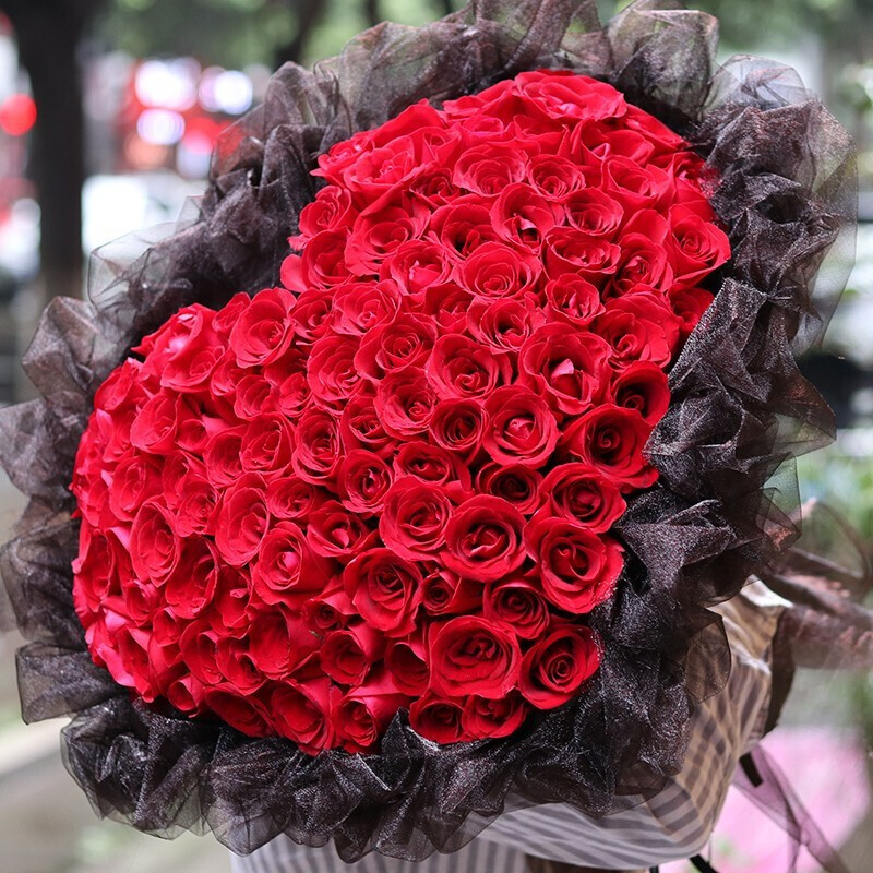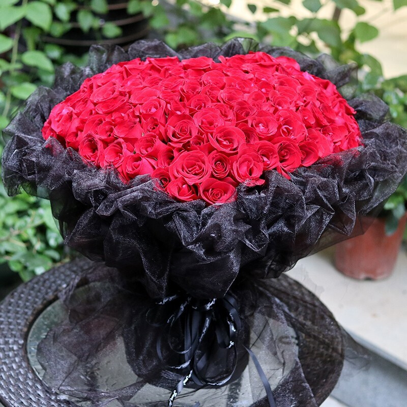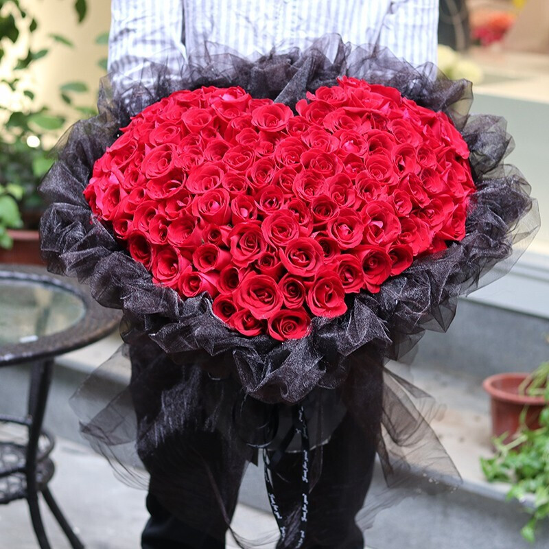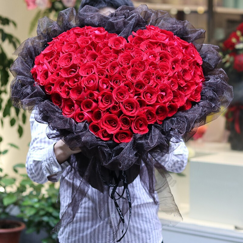 花材: 99朵红玫瑰,心形造型。黑色网纱外包。