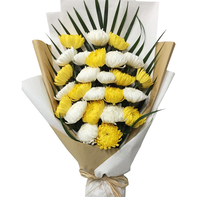 花 材:13朵白菊花,12朵黄菊花,散尾葵、绿叶搭配。