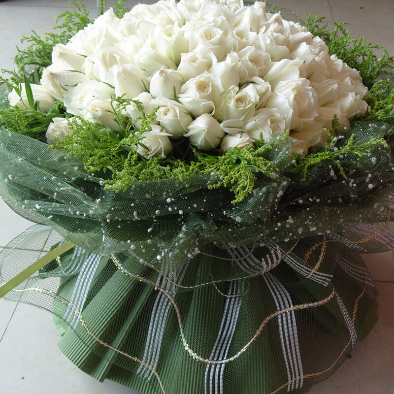 花 材:精选99朵白玫瑰,外围黄莺环绕。