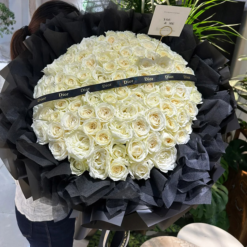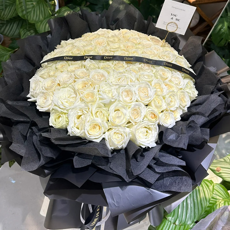 花 材:99朵优质白玫瑰,搭配黑色花纹缎带装饰花面。