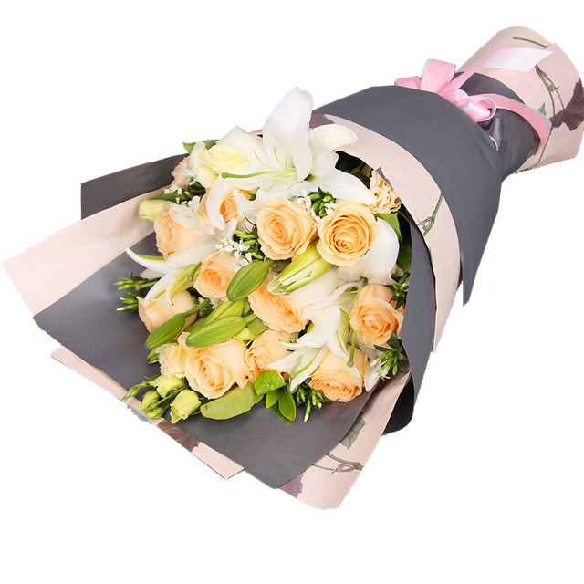 包 装:粉色印花纸+灰色平面纸呈扇形包装,粉色花结