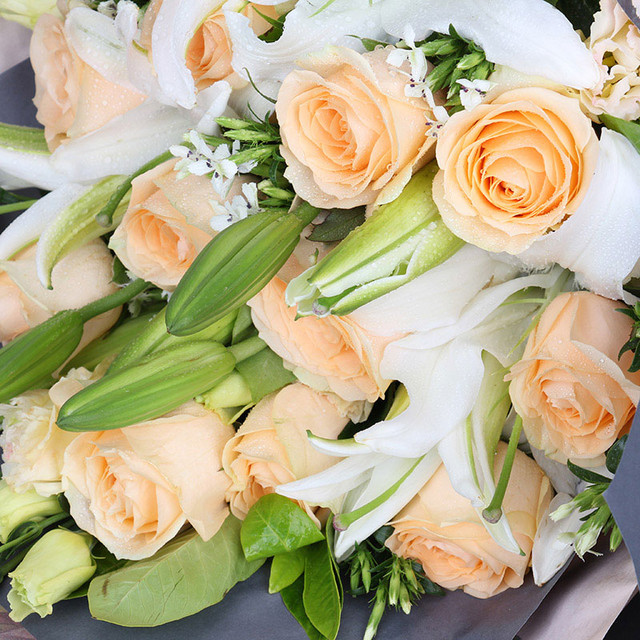 花材: 11枝香槟玫瑰,2枝香水百合,搭配相思梅