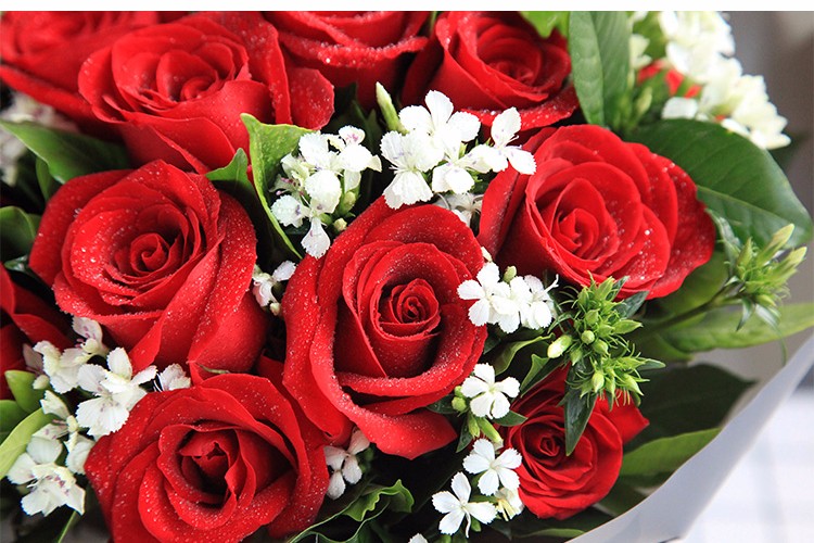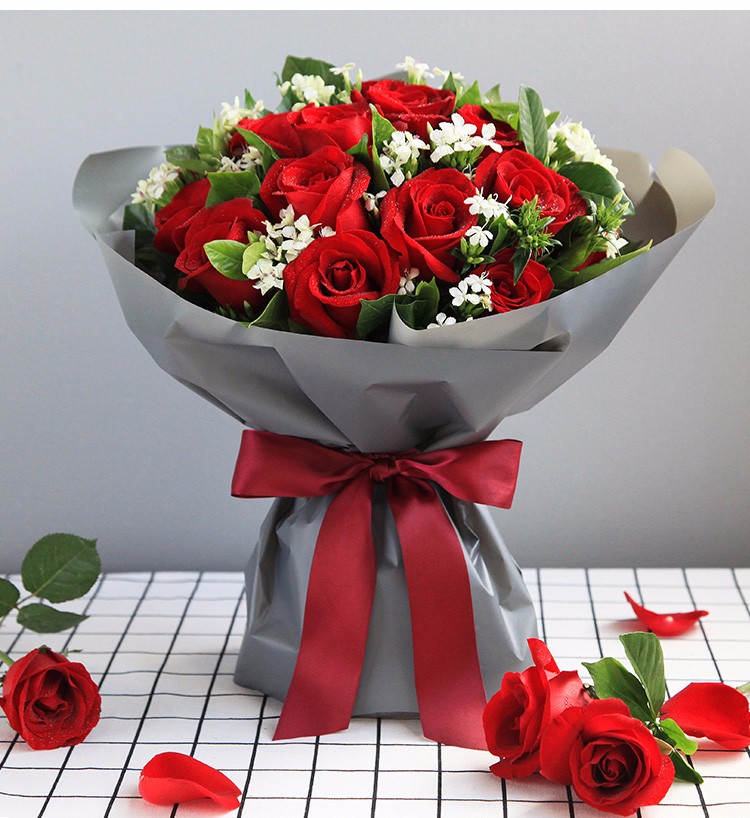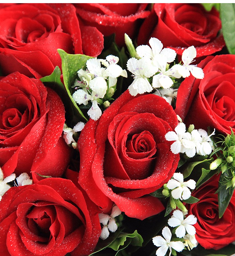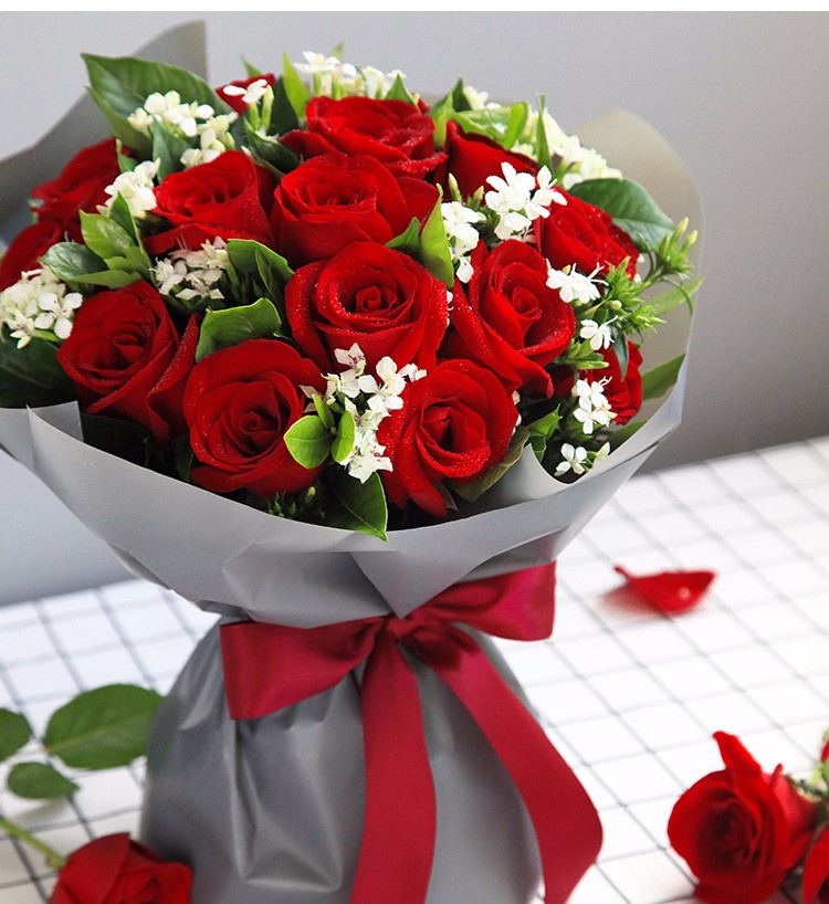 花材: 红玫瑰19枝,白色相思梅0.5扎,栀子叶1扎鲜花