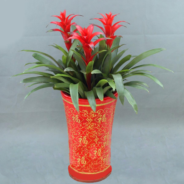 花 材: 就是观赏凤梨。其花和叶都仿佛涂了一层蜡质,柔中带硬而富有光泽。等顶叶片的基部,常相互紧叠成向外扩展的莲座状, 鸿运:大好的运气。顾红运、正是走好运的时候。