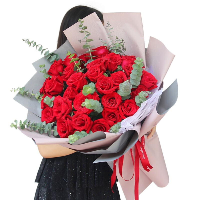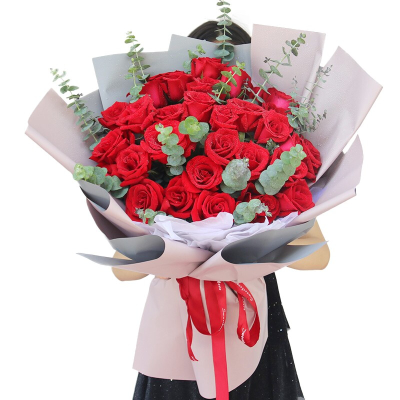 花材: 精选33枝红玫瑰,搭配尤加利叶。
