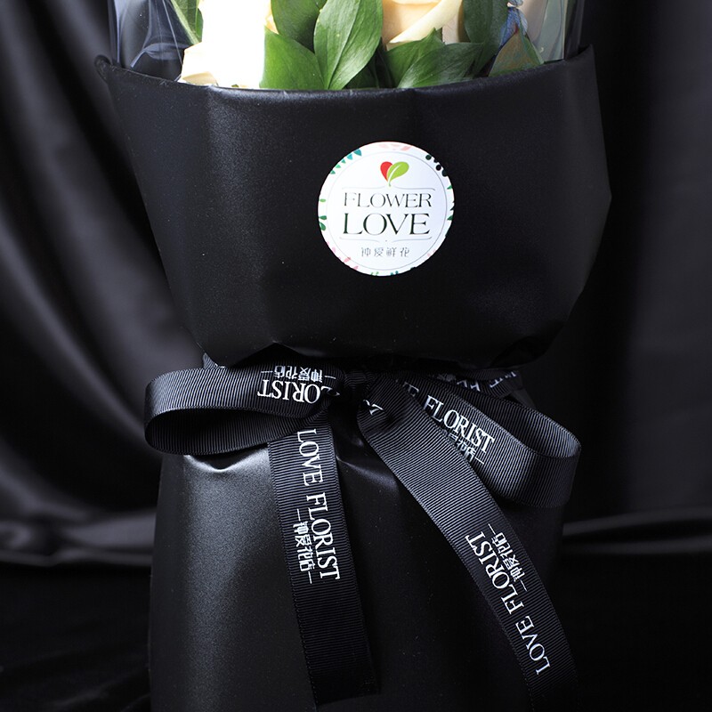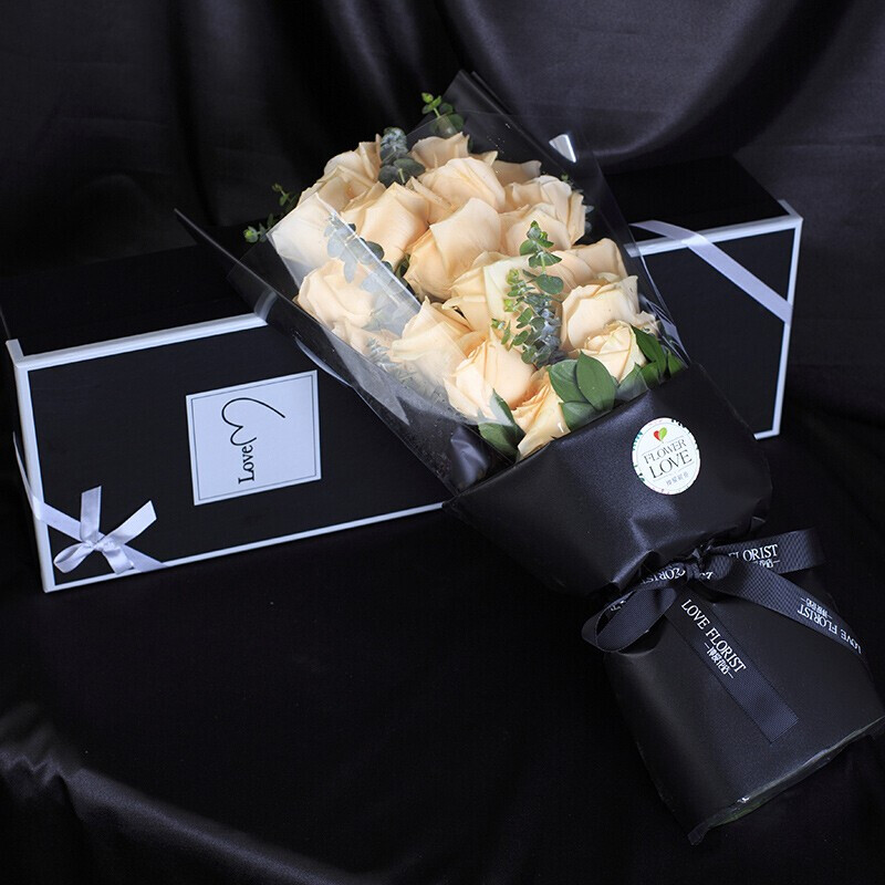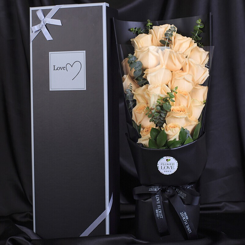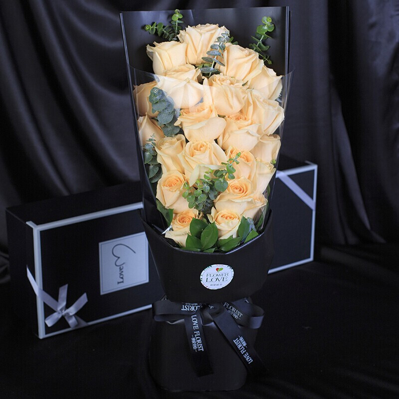 花材: 21朵顶级香槟玫瑰,搭配尤加利叶、绿叶点缀。