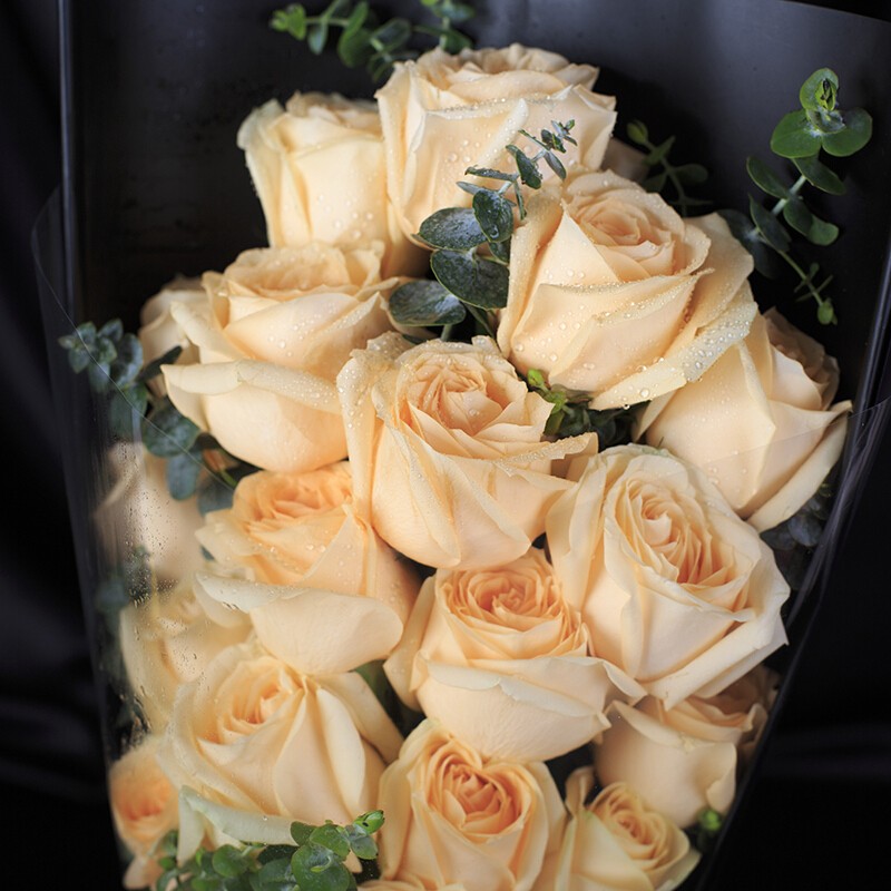 花 材:21朵顶级香槟玫瑰,搭配尤加利叶、绿叶点缀。