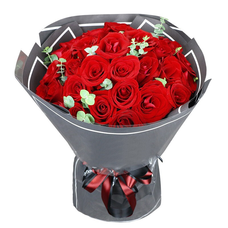 花 材:33朵红玫瑰,搭配尤加利叶装饰。