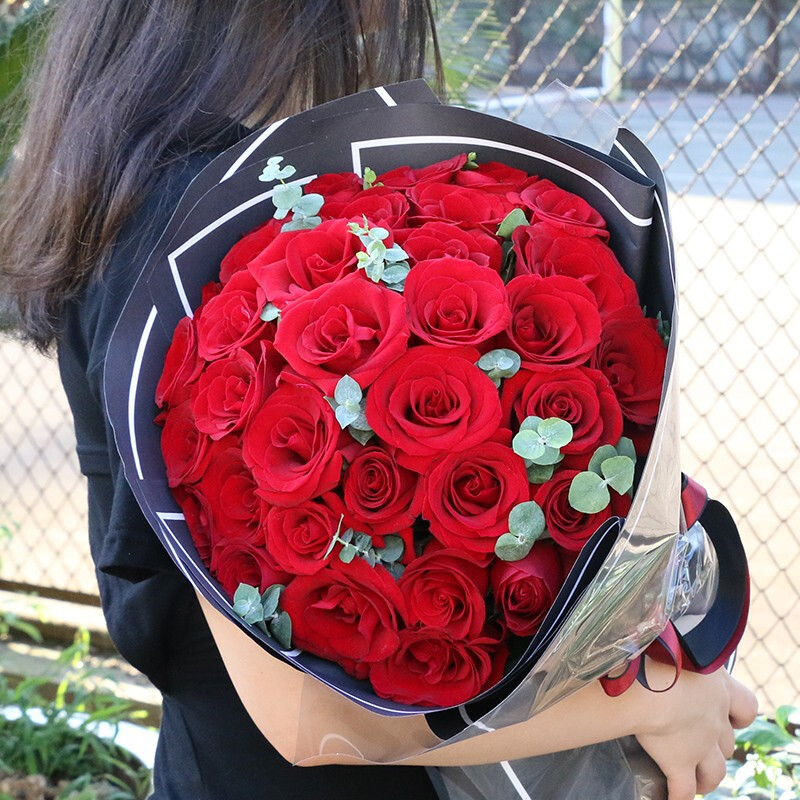 花材: 33朵红玫瑰,搭配尤加利叶装饰。