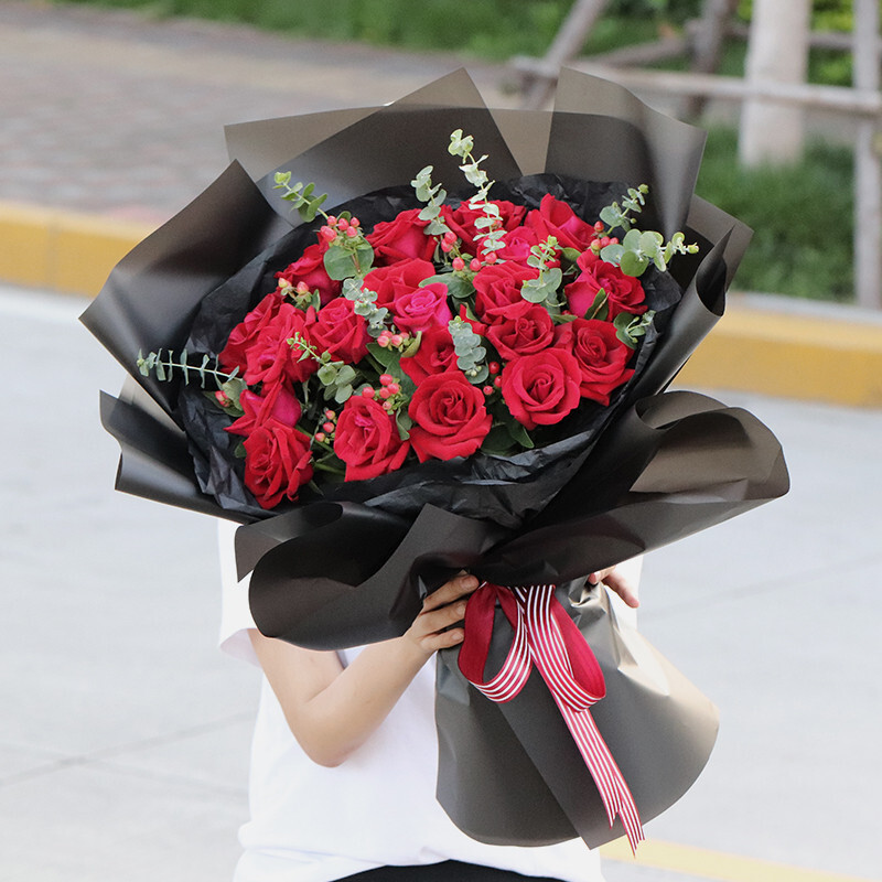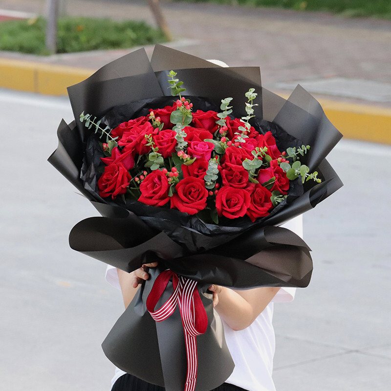 花材: 33朵红玫瑰,搭配尤加利叶,红豆装饰。