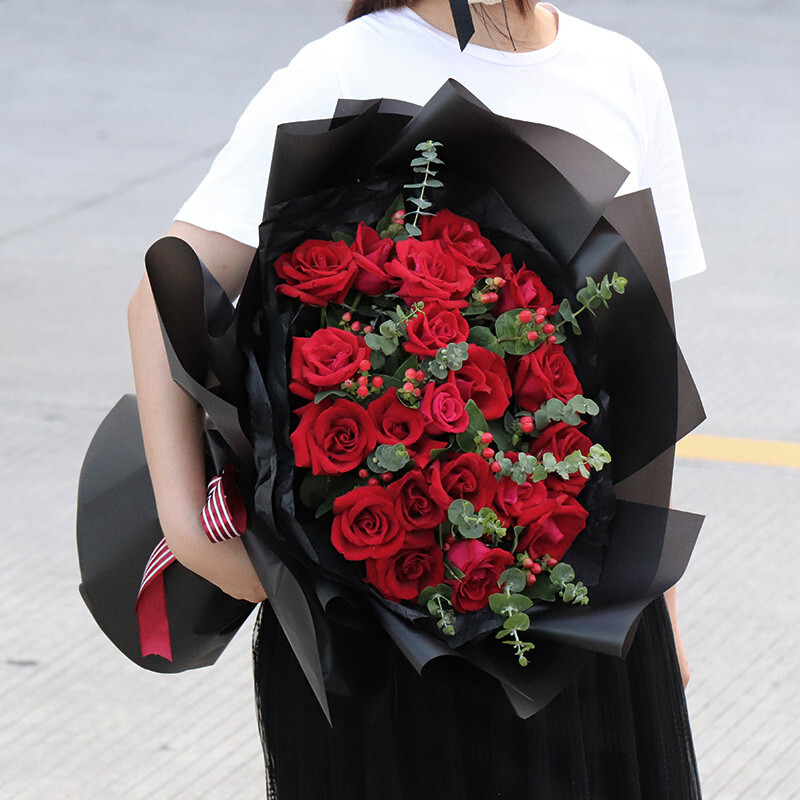 包装: 黑色雪梨纸内包,黑色雾面纸扇形包装,红色条纹花结。