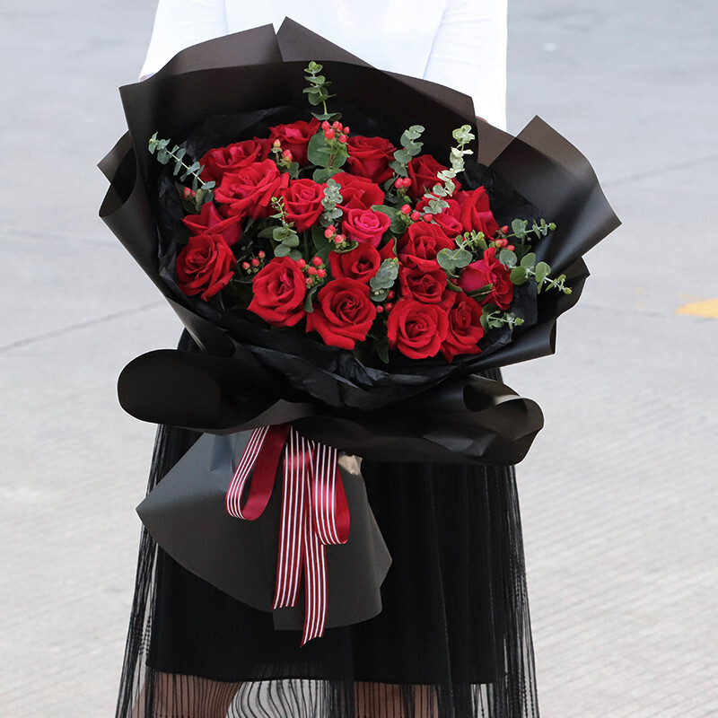 包 装:黑色雪梨纸内包,黑色雾面纸扇形包装,红色条纹花结。