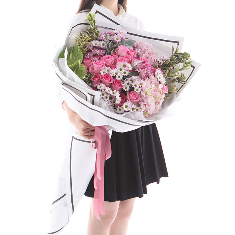 花 材:粉绣球2支、苏醒粉玫瑰19支、绿掌2支、紫边康乃馨6支、白粉色小雏菊15支,搭配适量金边黄楊、银叶菊装饰。(花束高度:1.2 - 1.3m 左右,人工测量有误差,具体以实物为准)