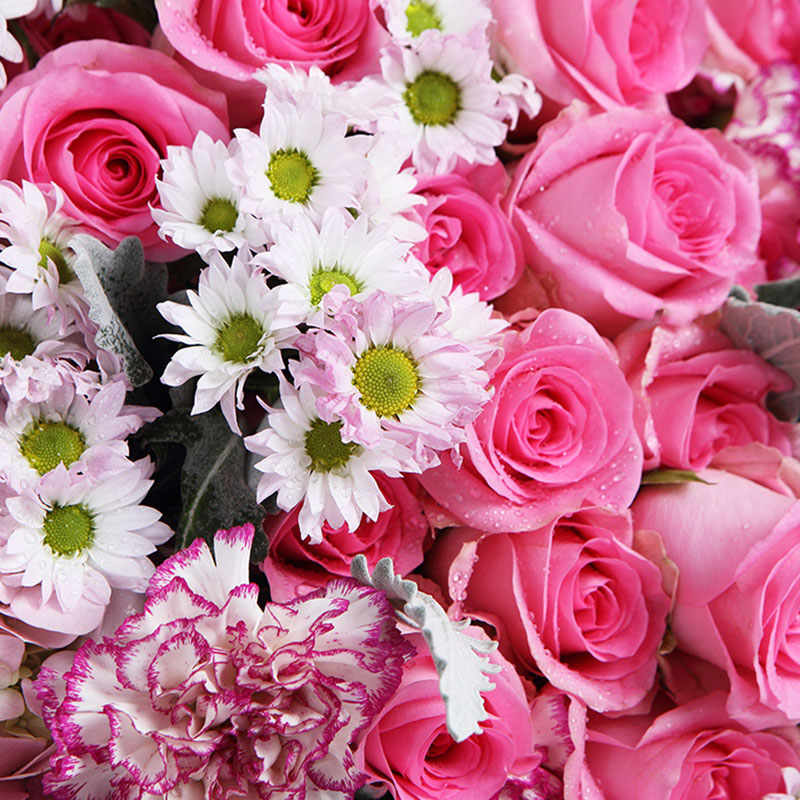 花材: 粉绣球2支、苏醒粉玫瑰19支、绿掌2支、紫边康乃馨6支、白粉色小雏菊15支,搭配适量金边黄楊、银叶菊装饰。(花束高度:1.2 - 1.3m 左右,人工测量有误差,具体以实物为准)