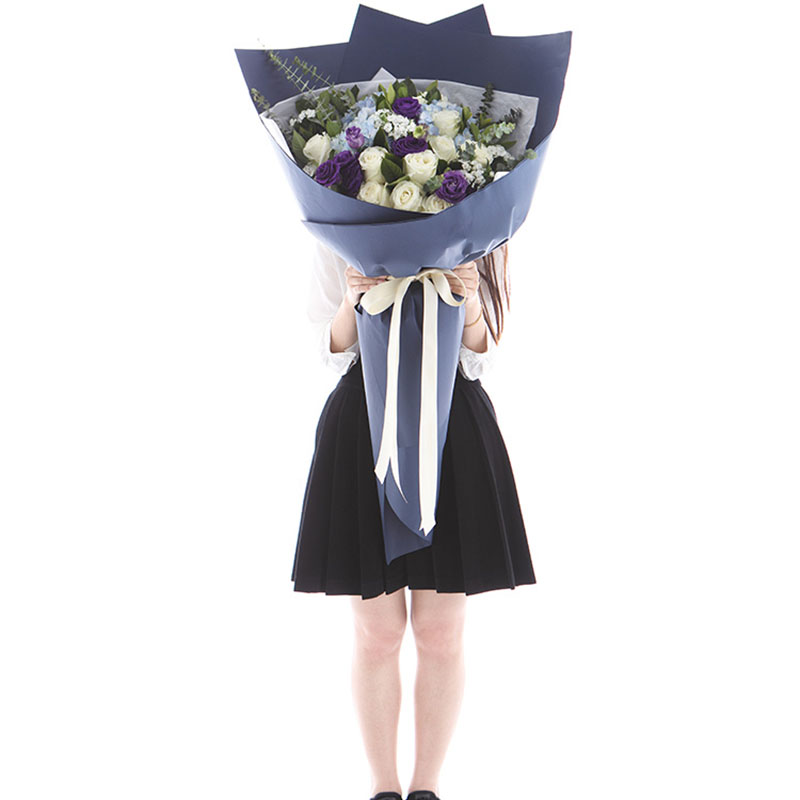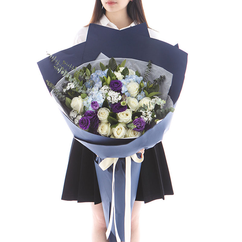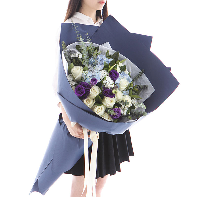 花材: 蓝绣球3支、白玫瑰11支、紫色洋桔梗5支,搭配7支白色相思梅、适量尤加利叶、栀子叶装饰。(花束高度:1.2 - 1.3m 左右,人工测量有误差,具体以实物为准)