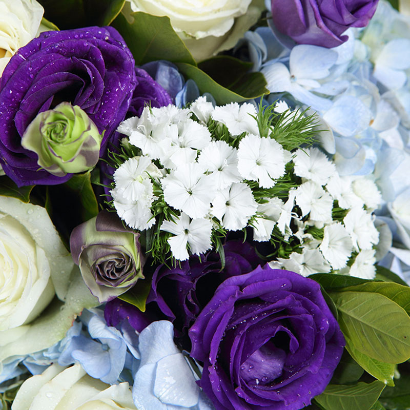 花 材:蓝绣球3支、白玫瑰11支、紫色洋桔梗5支,搭配7支白色相思梅、适量尤加利叶、栀子叶装饰。(花束高度:1.2 - 1.3m 左右,人工测量有误差,具体以实物为准)