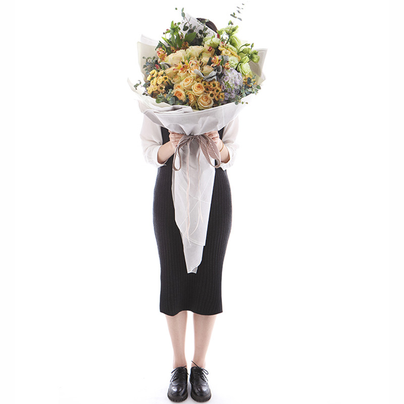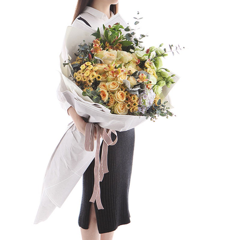 包装: 白色硬纸+白色雪梨纸韩式扇形包装,精美咖啡色条纹丝带蝴蝶结束扎。(花束高度:1.2 - 1.3m 左右,人工测量有误差,具体以实物为准)