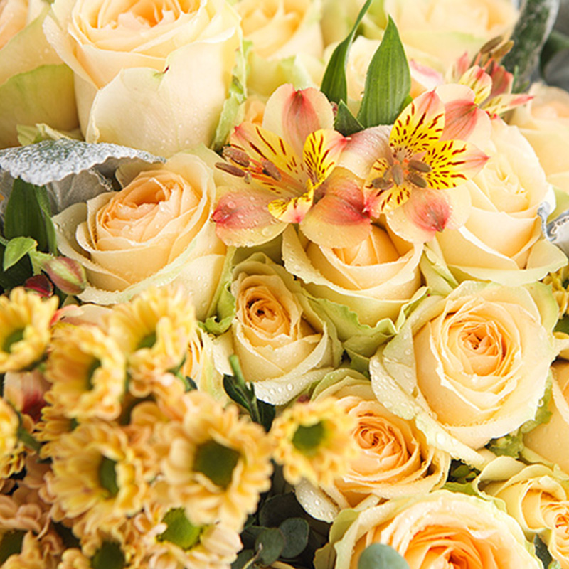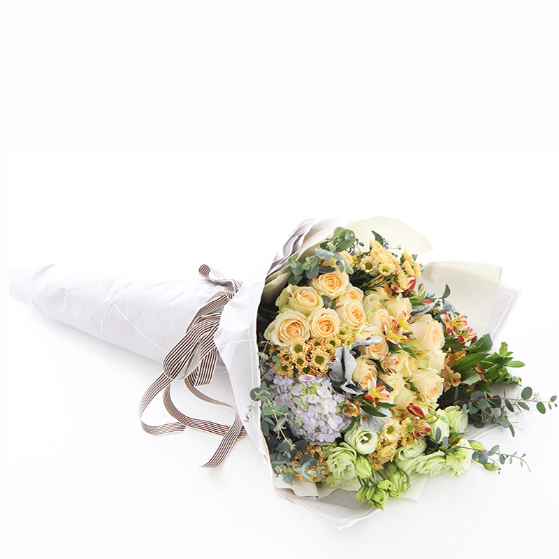 花 材:香槟玫瑰19支、浅紫色绣球1支、绿色洋桔梗4支、黄色小雏菊10支,搭配适量黄色水仙百合、尤加利叶、银叶菊装饰。(请至少提前1天订购,或订购前咨询客服)