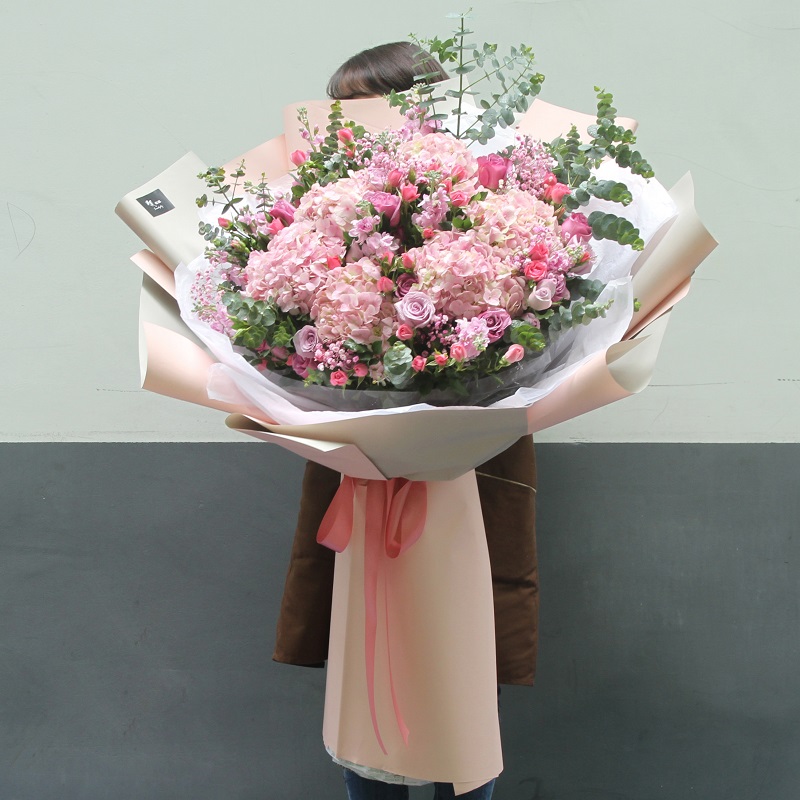 花材: 6支粉绣球、11支紫玫瑰、19支粉色多头小玫瑰,搭配适量尤加利叶、粉色满天星装饰。(花束高度:1.2 - 1.3m 左右,人工测量有误差,具体以实物为准)