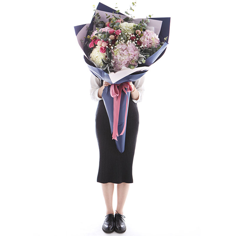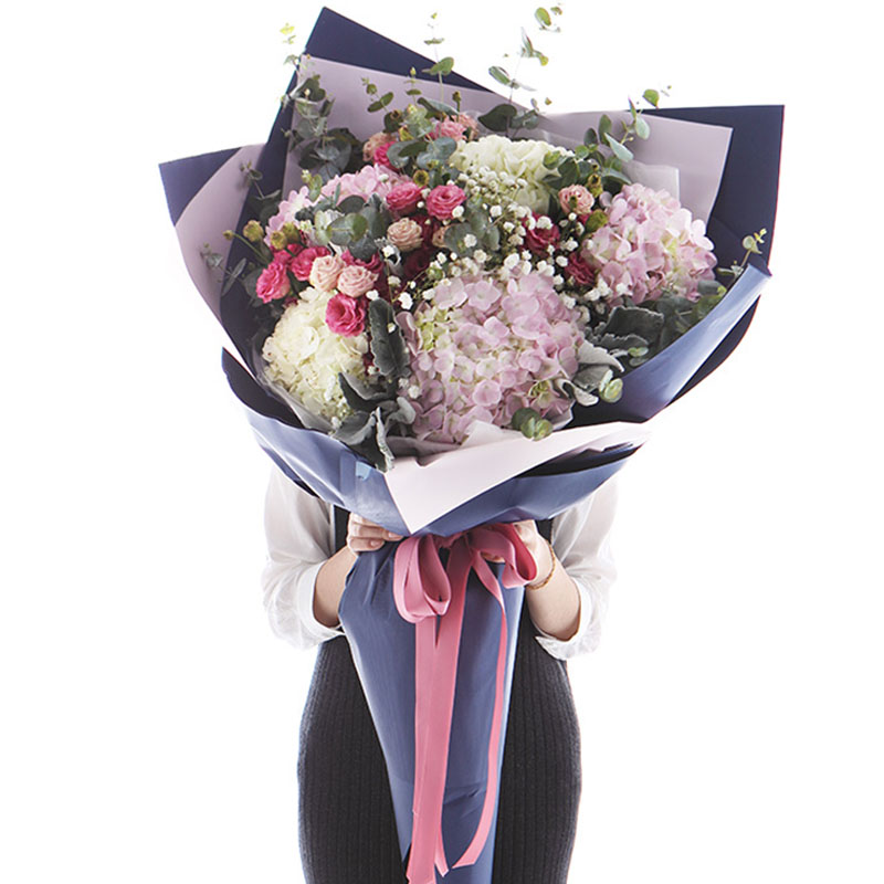 包装: 粉色硬纸+蓝色硬纸韩式扇形包装,精美粉色丝带蝴蝶结束扎。(花束高度:1.2 - 1.3m 左右,人工测量有误差,具体以实物为准)