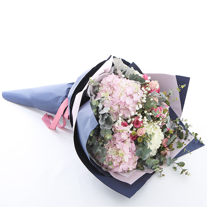 花材: 粉绣球3枝、白绣球2枝、粉色洋桔梗6支、粉佳人6支,搭配适量白色满天星、银叶菊、尤加利叶装饰。(请至少提前1天订购,或订购前咨询客服)
