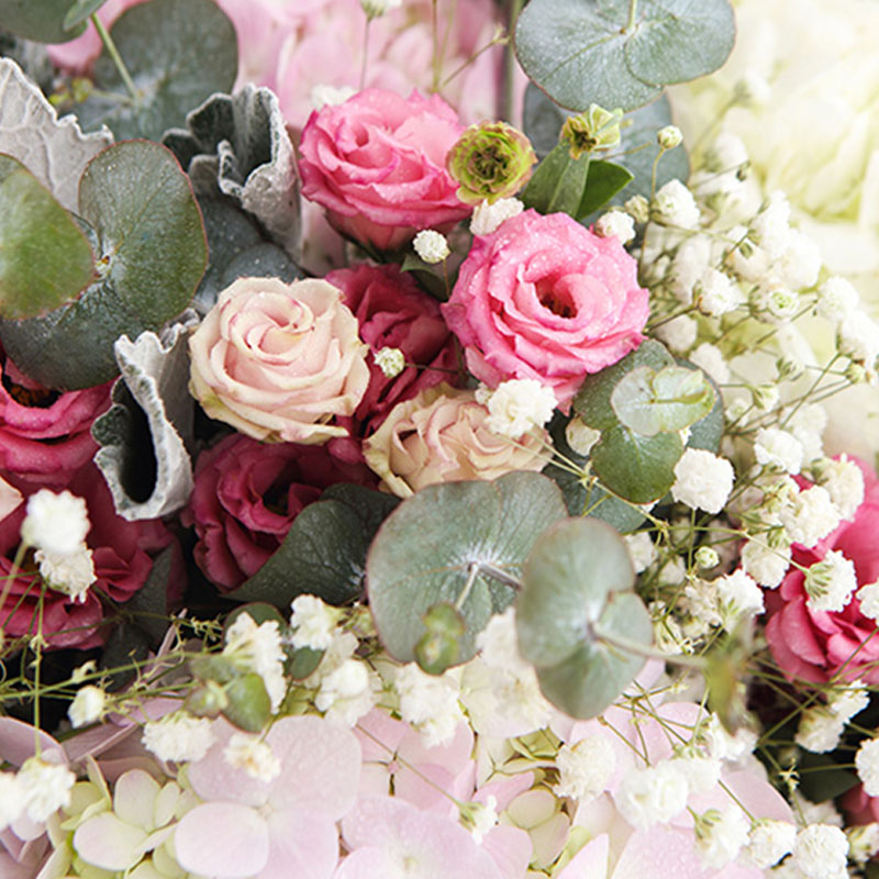 花 材:粉绣球3枝、白绣球2枝、粉色洋桔梗6支、粉佳人6支,搭配适量白色满天星、银叶菊、尤加利叶装饰。(请至少提前1天订购,或订购前咨询客服)