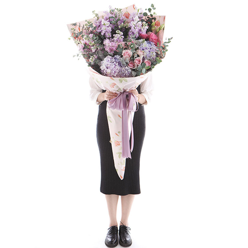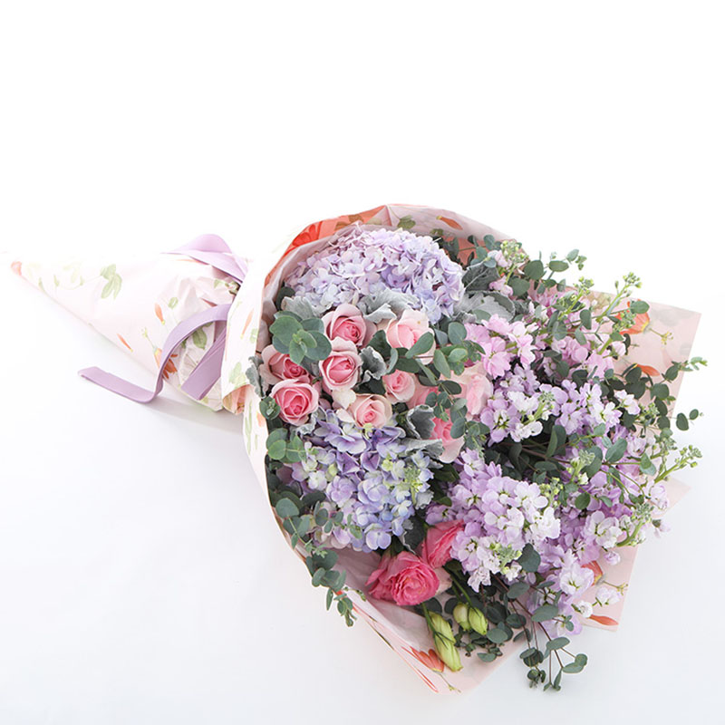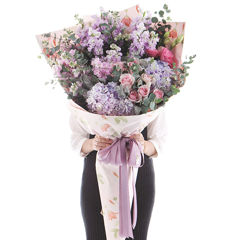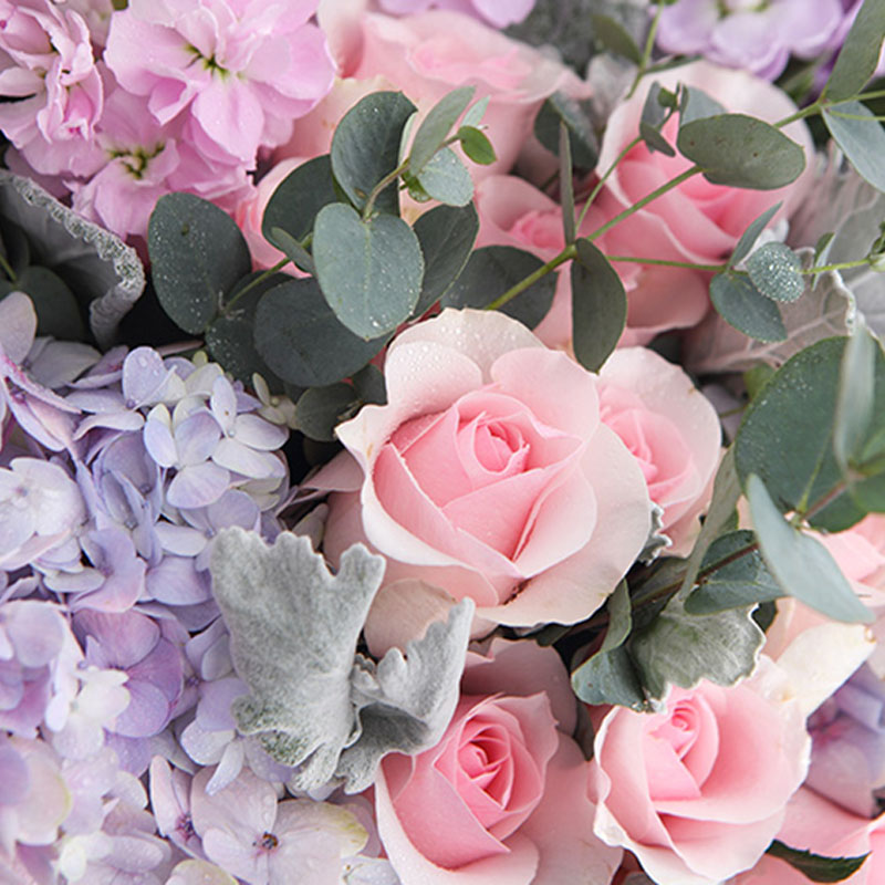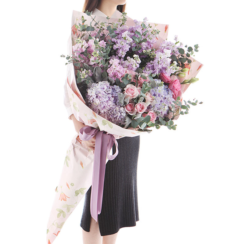 花 材:粉佳人11支、浅紫色绣球花2支、粉色洋桔梗3支、紫色紫罗兰8支、粉色紫罗兰8支,搭配适量尤加利叶、银叶菊装饰。(请至少提前1天订购,或订购前咨询客服)