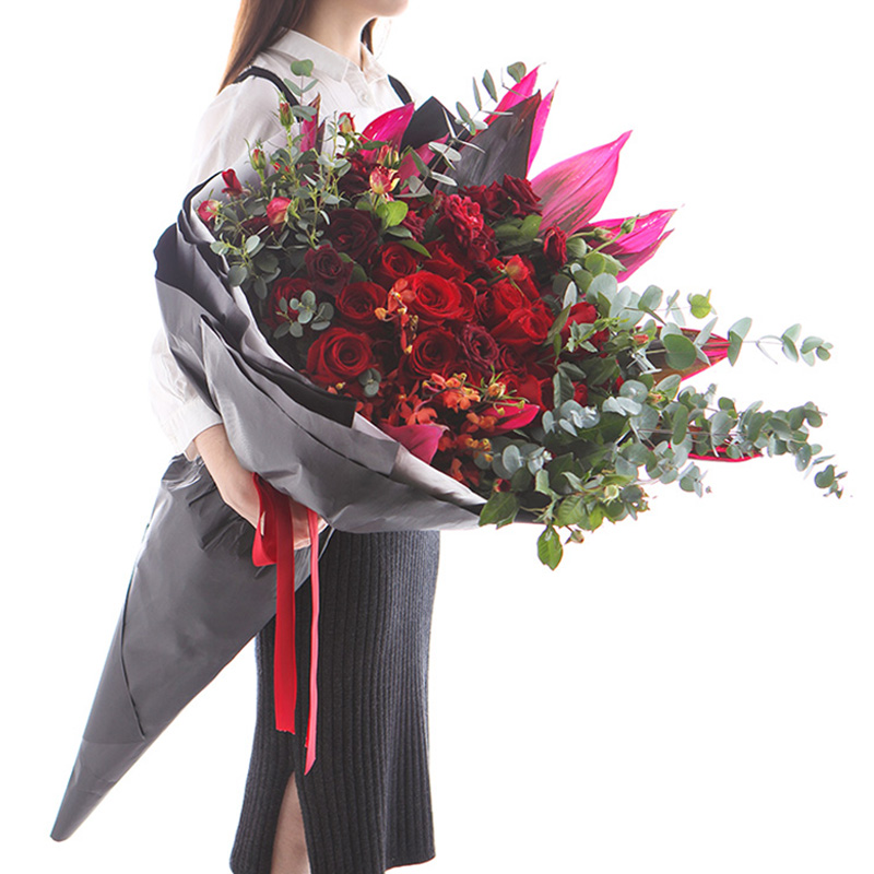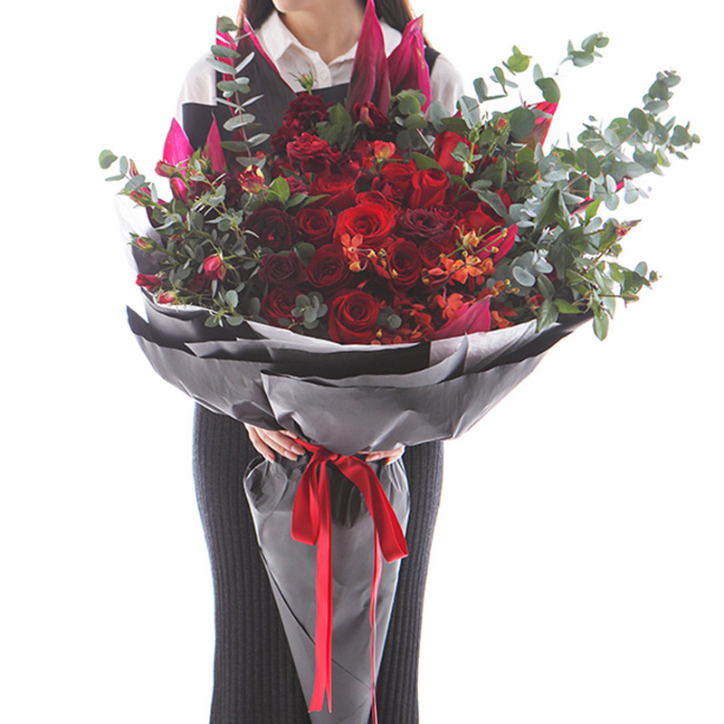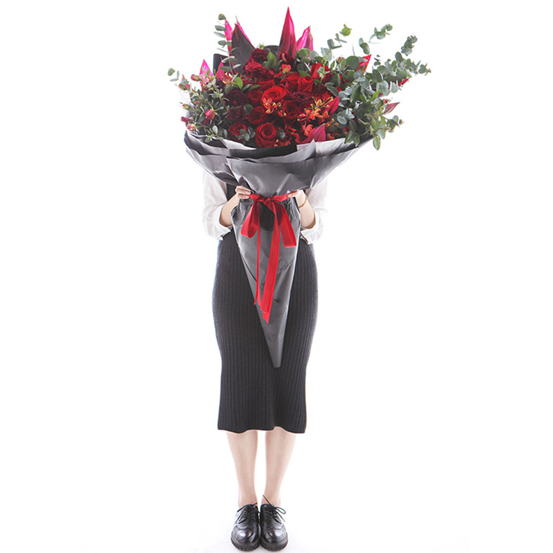 包装: 白色硬纸+黑色硬纸韩式扇形包装,精美红色丝带蝴蝶结束扎。(花束高度:1.2 - 1.3m 左右,人工测量有误差,具体以实物为准)