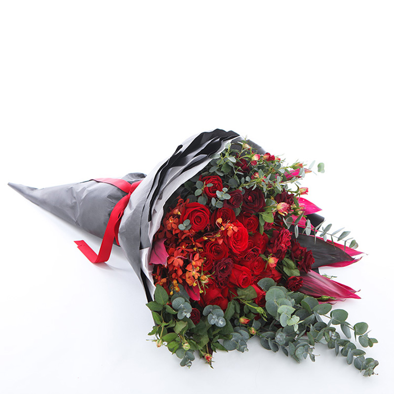 花 材:卡罗拉红玫瑰33支、大红色多头玫瑰10支,搭配适量红色千代兰、红色朱蕉叶、尤加利叶装饰。(请至少提前1天订购,或订购前咨询客服)