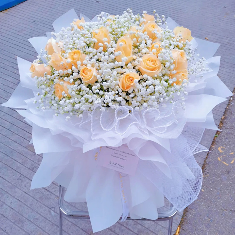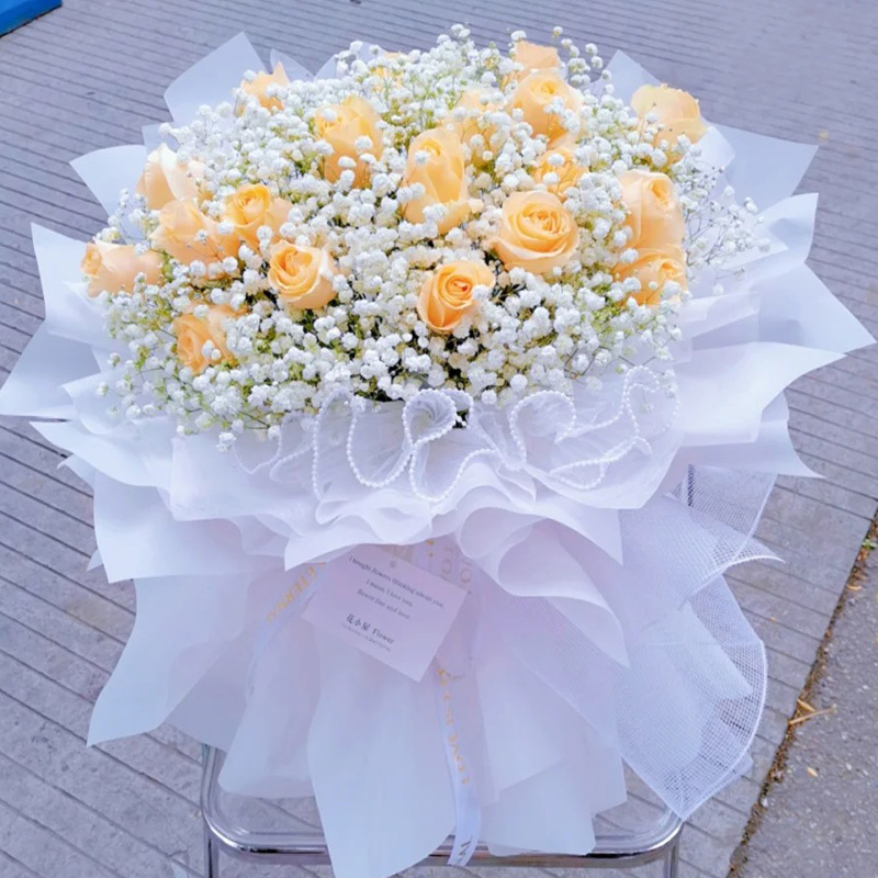 花材: 19朵香槟玫瑰,搭配满天星丰满装饰。